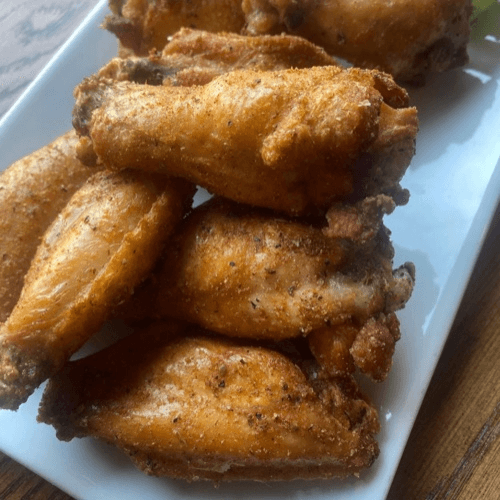 Frank's hot sauce, mozzarella, chicken, blue cheese crumble, crushed red pepper, and blue cheese drizzle