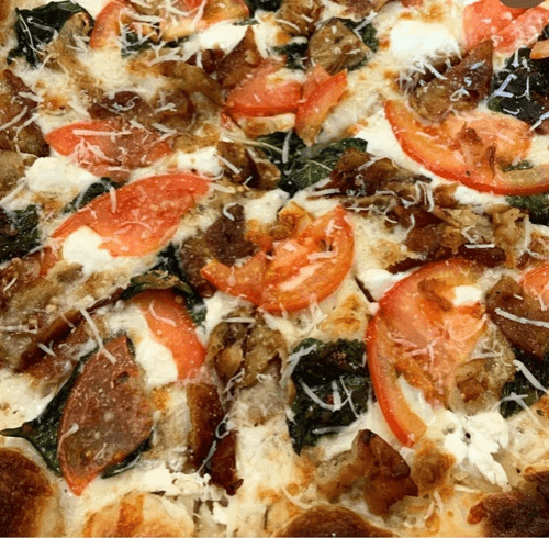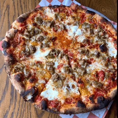 Italian hot sausage and tri colored peppers, mozzarella, burrata, onion, and garlic