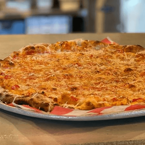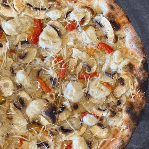 White pie, housemade cashew mozzarella, hot cherry peppers, mushroom, garlic, plant based shredded mozzarella and agave truffle