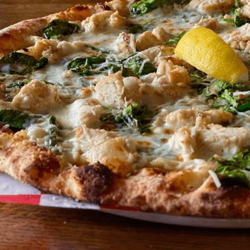 White pie with a lemon cream sauce base, mozzarella, chicken, spinach, fresh garlic