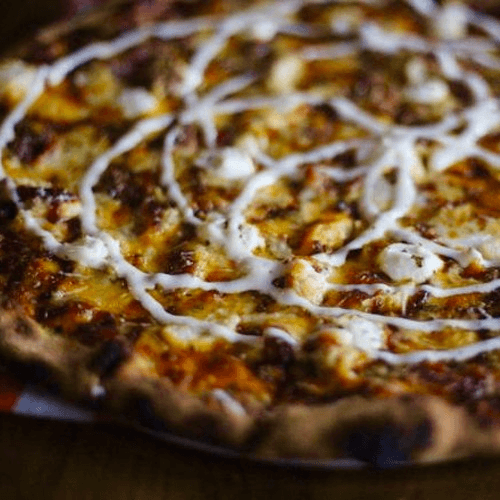 Cheddar cheese, mozzarella, chicken, bacon, BBQ sauce, fresh ricotta, onion, and ranch drizzle