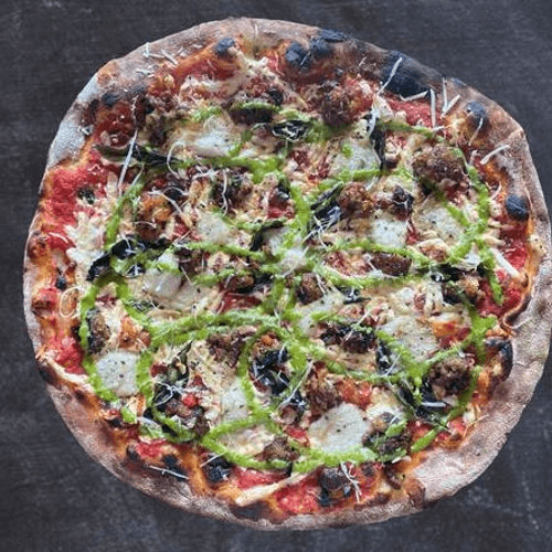 Red pie, plant-based mozzarella cheese, house made cashew cheese, plant-based meatballs, garlic, fresh basil, and pesto drizzle
