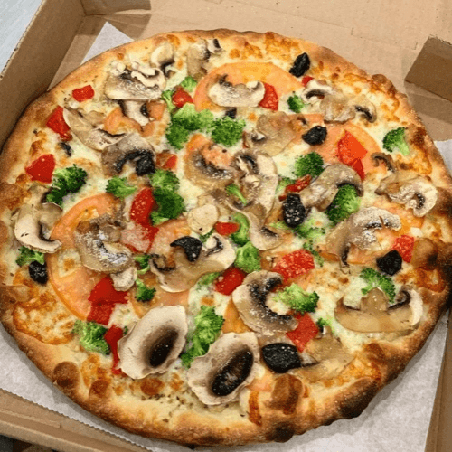White pie, cured olives, mushrooms, fresh tomato, roasted red peppers, onion, broccoli, mozzarella, and truffle oil drizzle